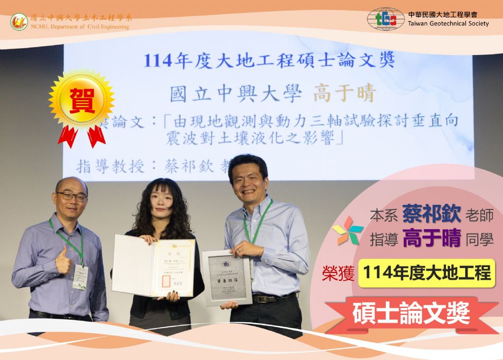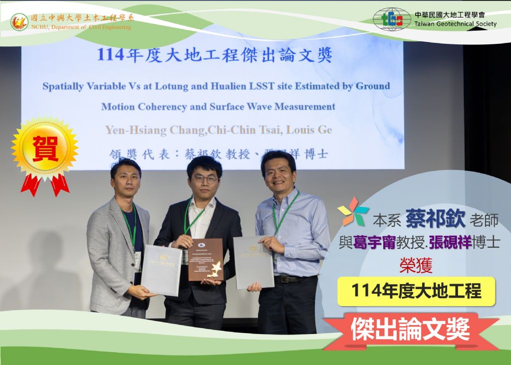 本系蔡祁欽老師榮獲114年度大地工程...